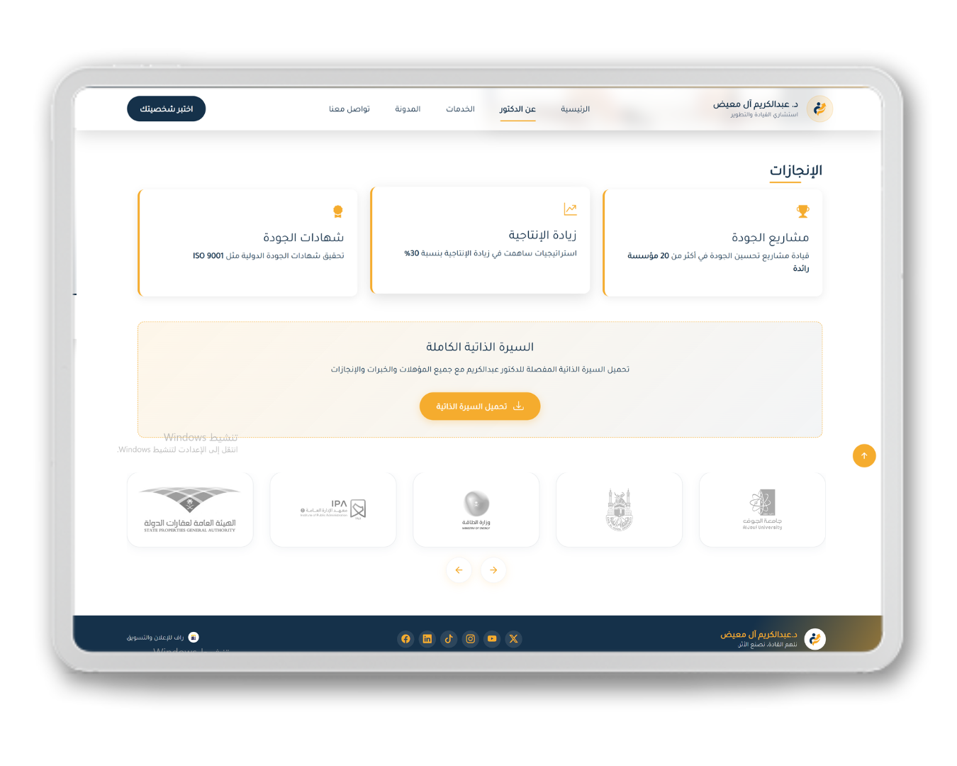 موقع تعريفي احترافي للدكتور عبدالكريم آل معيض يعرض السيرة الذاتية، الخبرات، البرامج التدريبية، والشهادات. صُمم الموقع لتسهيل التواصل مع العملاء واستعراض إنجازات الدكتور بشكل عصري وموثوق.
